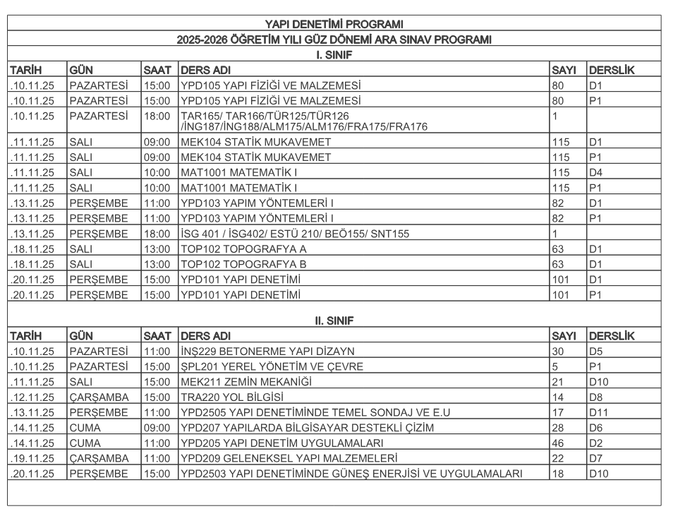 2025-2026 Güz Dönemi Ara Sınav Programı - KESİN